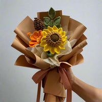 Cheer someone up with the vibrant energy of nature's cheerfulness with our "Cheerful Radiance" Crochet Flower Bouquet Set. Crafted with meticulous attention to detail, this bouquet features a radiant sunflower, a charming pine cone, a verdant green leaf, and a delicate orange cosmos flower, creating a delightful ensemble that brings joy and positivity to any setting.