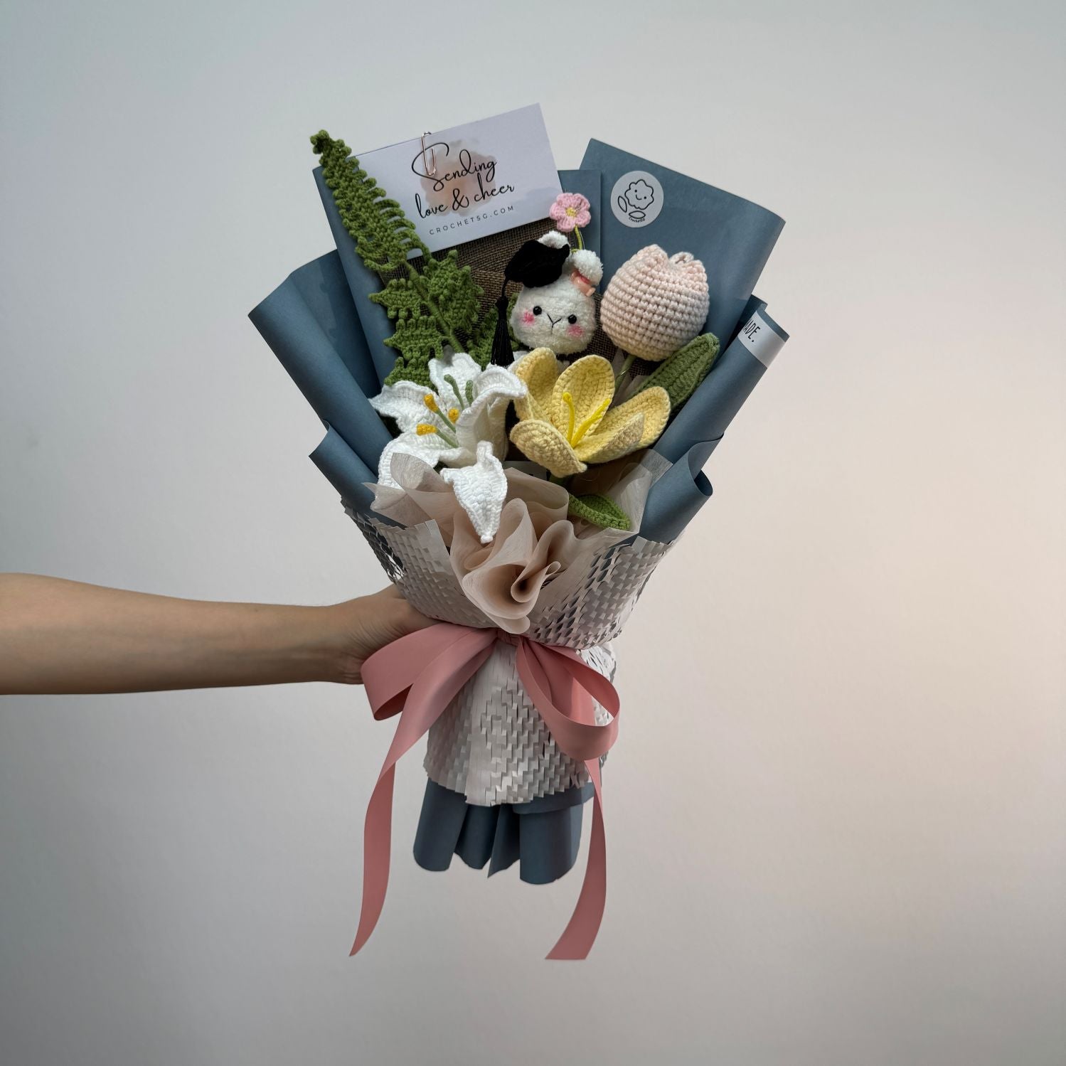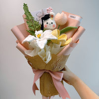 Elevate your space with a dash of charm and academic elegance with our Scholar Bunny Crochet Flower Bouquet. Meticulously handcrafted to perfection, this enchanting bouquet features a white rabbit head adorned with a black mortarboard, symbolizing knowledge and achievement. Paired with delicate White Blooming Tulips and an array of Pink, and White Forget-Me-Nots, this bouquet is a timeless celebration of academic success.