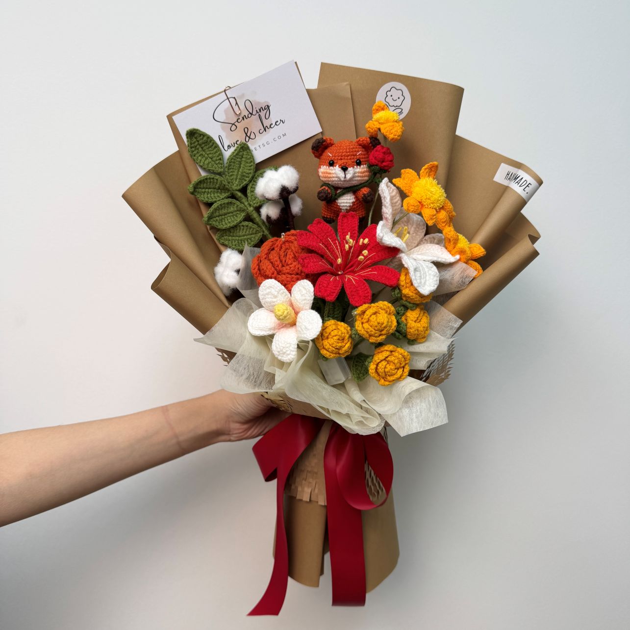Celebrate love in the most heart-warming way with Golden Joy, a handcrafted crochet flower bouquet designed to spark smiles and lasting memories. Featuring an adorable Red Panda amigurumi nestled among rich orange blooms and soft neutral tones, this bouquet is a perfect blend of romance, joy, and personality. Thoughtfully created for Valentine’s Day, Golden Joy is a meaningful gift that stands out from traditional flowers — and lasts forever.