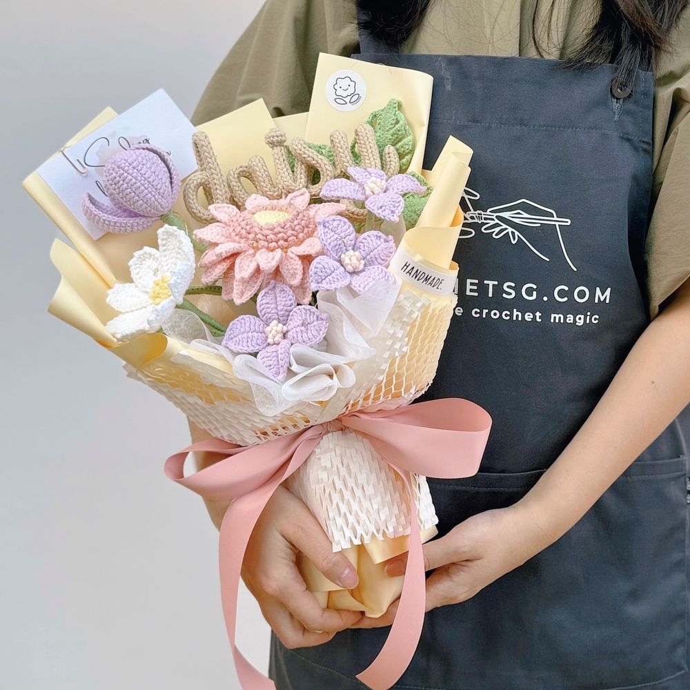 Make your bouquet truly unique and special with our exclusive Add-On Crochet Name feature. Crafted with care using high-quality yarn and wire, this personalized touch transforms your bouquet into a one-of-a-kind masterpiece.