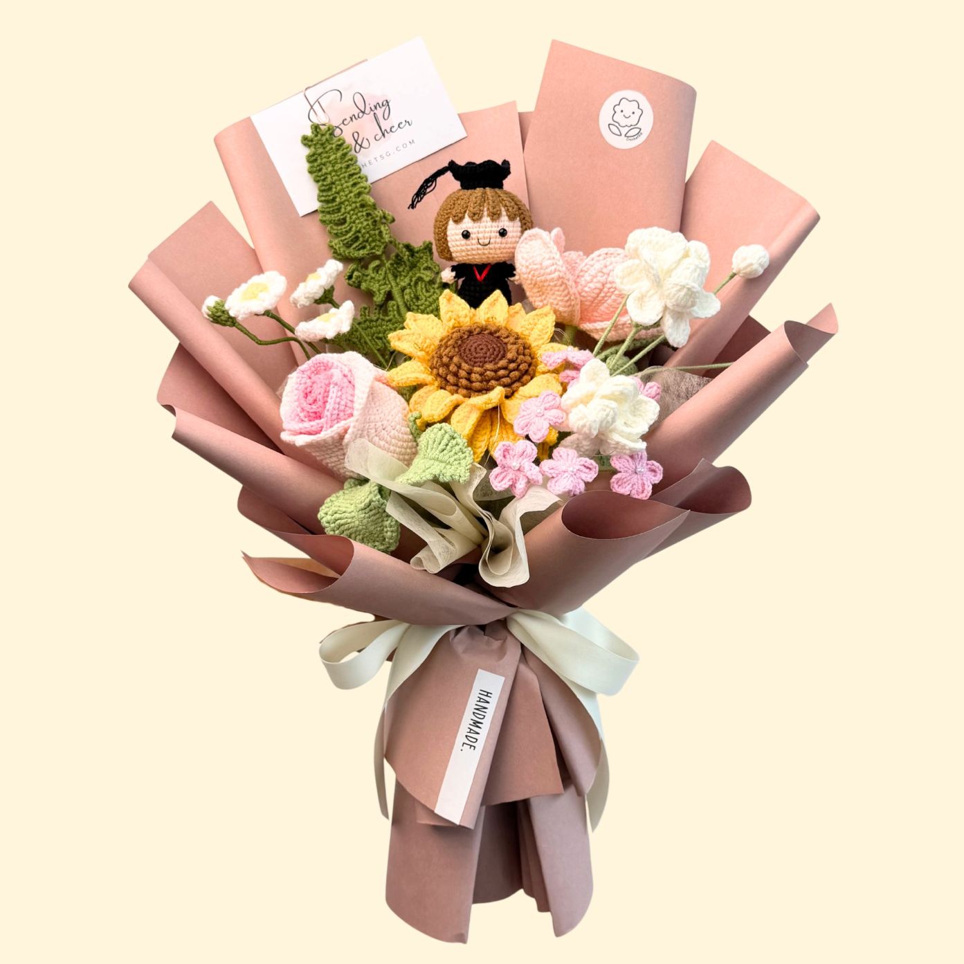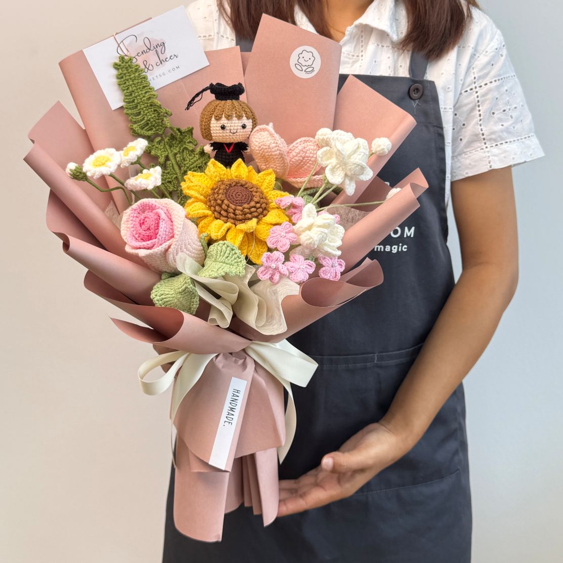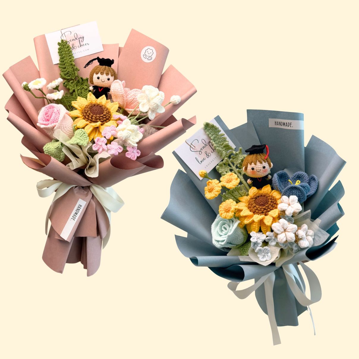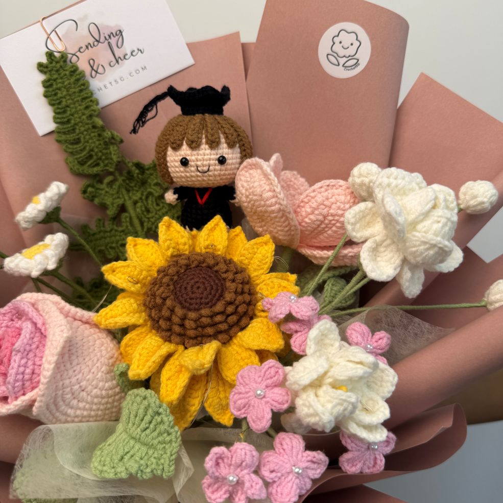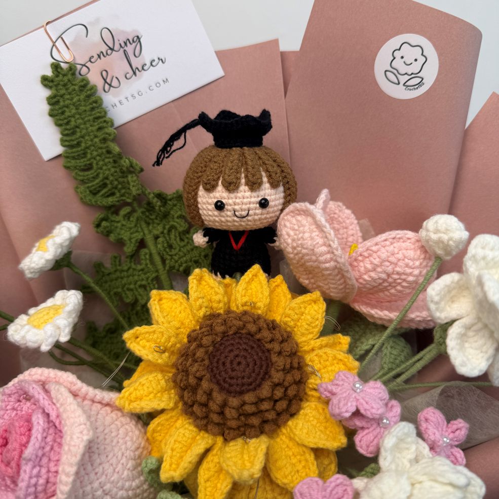 Elevate your gifting experience with our exquisite A Smart Cookie crochet flower bouquet set. Handcrafted with love and attention to detail, this bouquet showcases a stunning combination of crochet flowers and the full body graduation character! (Boy/Girl)Â