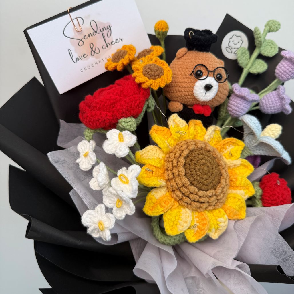 Celebrate a milestone worth remembering with Beary Fantastic, a heartwarming crochet bouquet designed to honor achievements and new beginnings. Featuring an adorable amigurumi bear dressed for graduation, this bouquet is a meaningful keepsake that captures the joy, pride, and excitement of this special momentโperfect for gifting your favorite graduate.