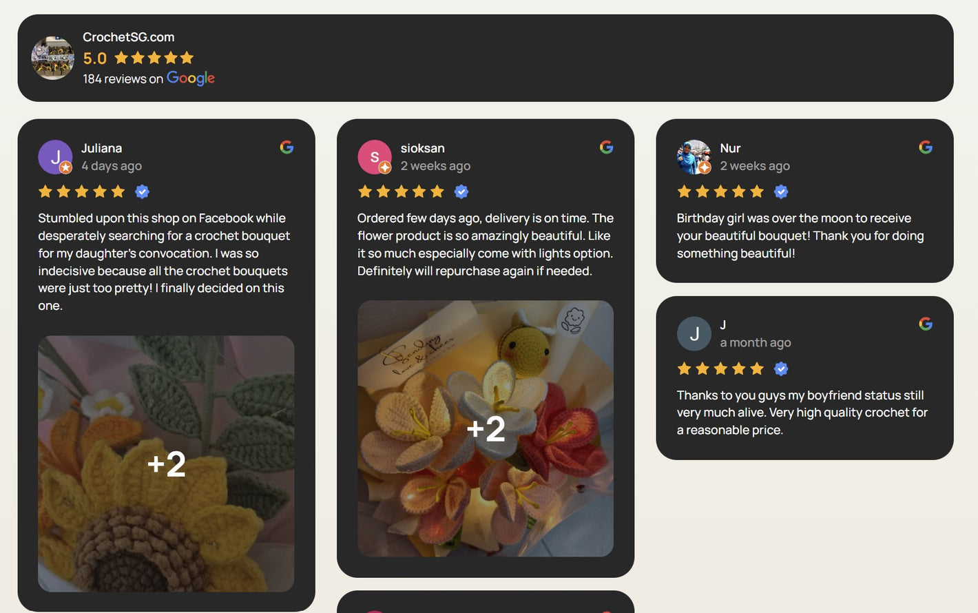 CrochetSG was founded in 2023 by a passionate Singapore grandmother who wanted to share her love for handmade crochet flowers. What started as a small home-based hobby has grown into a trusted brand for crochet flowers in Singapore.
