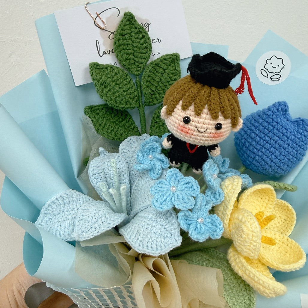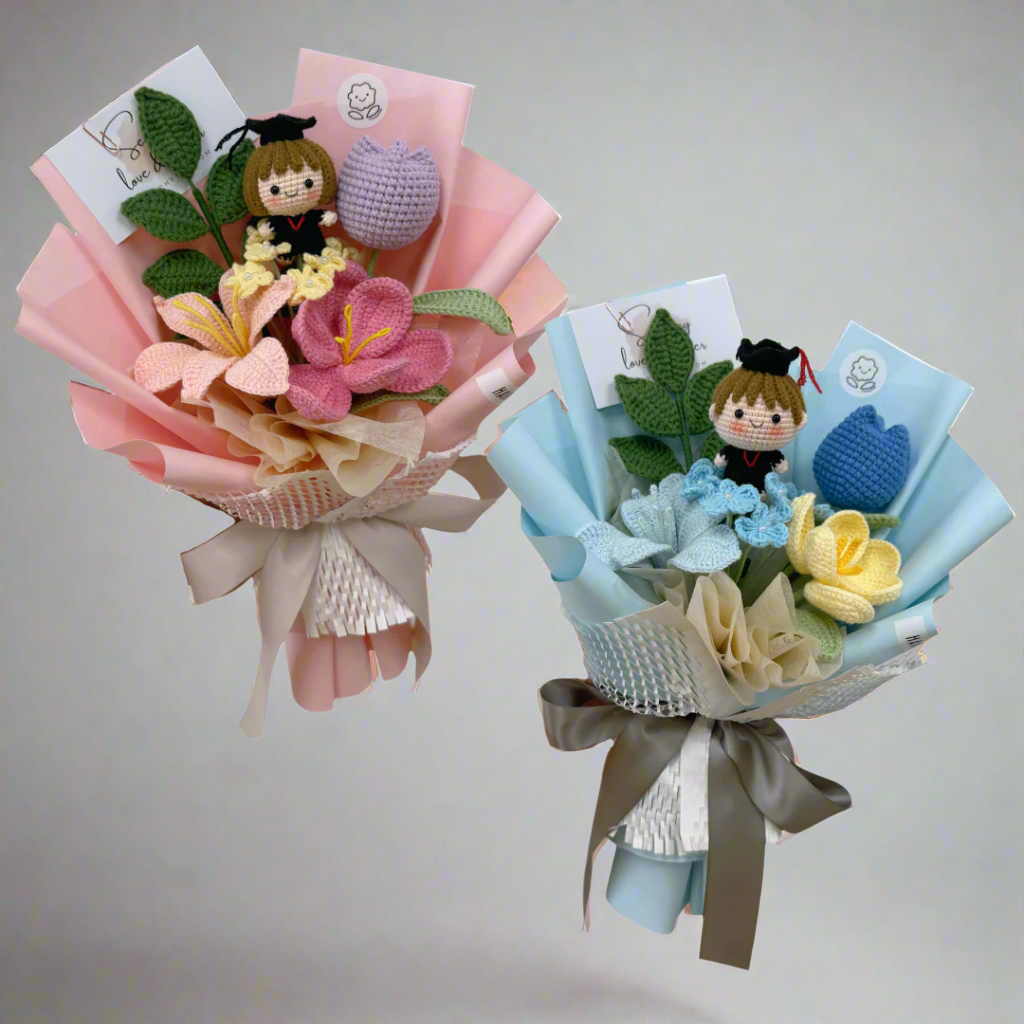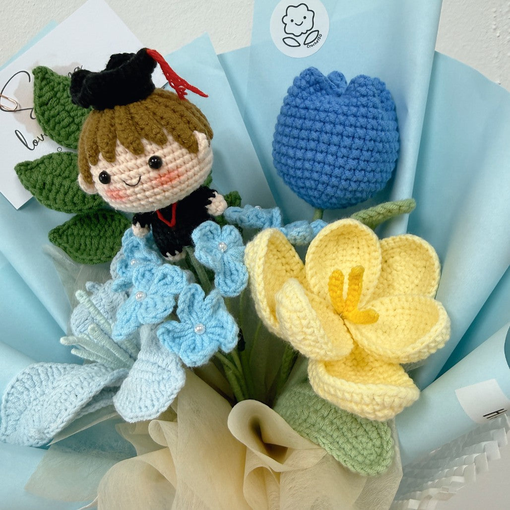 Elevate your gifting experience with our exquisite Bright Beginnings crochet flower bouquet set. Handcrafted with love and attention to detail, this bouquet showcases a stunning combination of green leaves, chubby tulip, blooming tulip, forget me not, Lewisia and of course, the full body graduation character! (Boy/Girl)