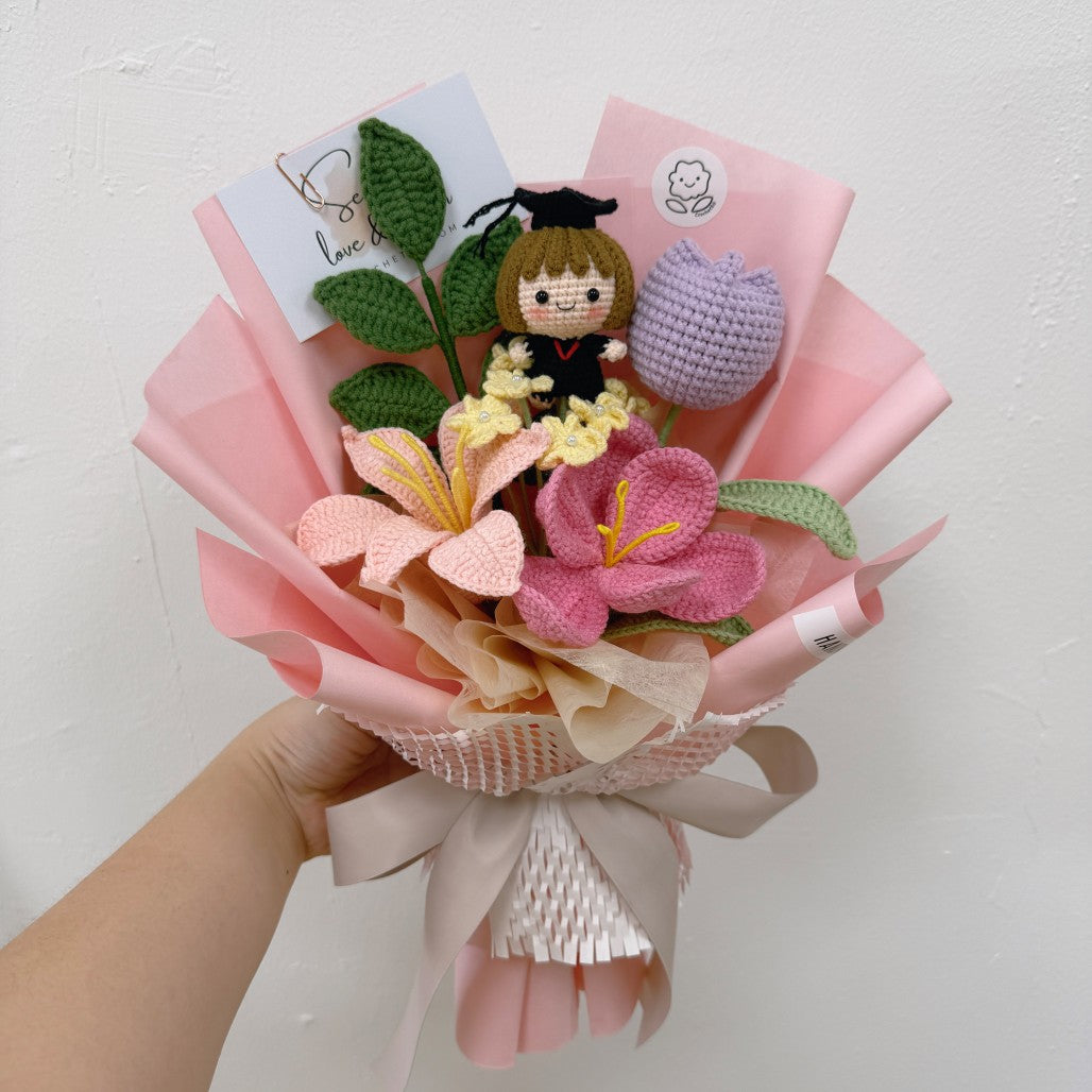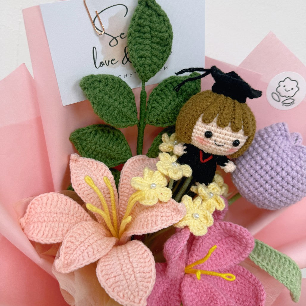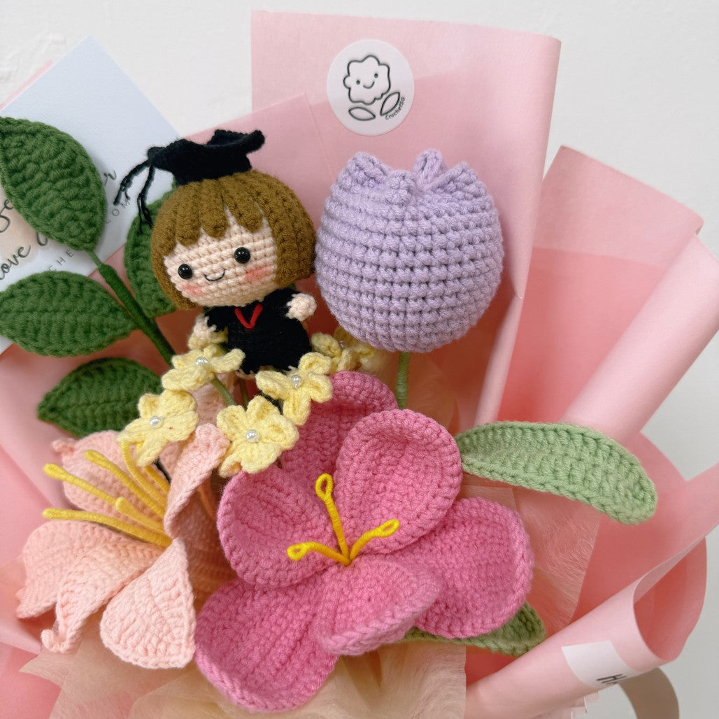 Elevate your gifting experience with our exquisite Bright Beginnings crochet flower bouquet set. Handcrafted with love and attention to detail, this bouquet showcases a stunning combination of green leaves, chubby tulip, blooming tulip, forget me not, Lewisia and of course, the full body graduation character! (Boy/Girl)