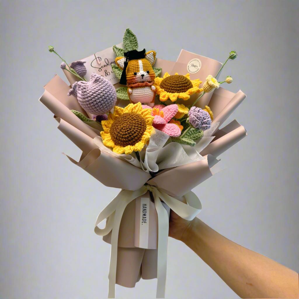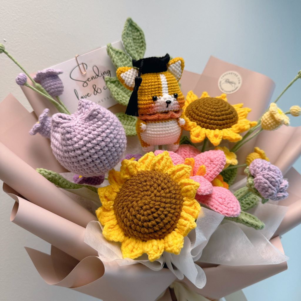 Celebrate life’s proudest moments with Corg-ratulations—a charming crochet flower bouquet starring an adorable corgi in a graduation cap, perfect for congratulating loved ones on their achievements. Whether it’s a graduation, a new job, or any milestone worth celebrating, this handcrafted bouquet is a heartfelt keepsake that lasts forever, just like your pride and joy!