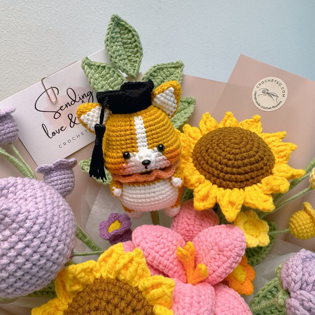 🎓🐾 Corg-ratulations – A Crochet Corgi Bouquet to Celebrate Success! 🌻✨ (corgi will be changed from pic 1 to Pic 2 & 3)