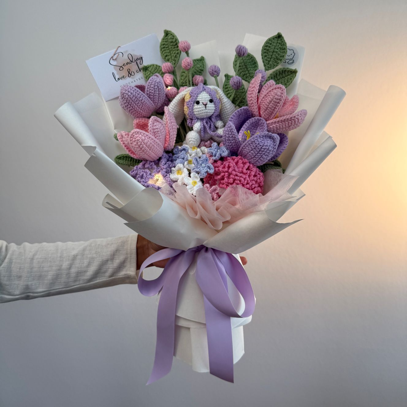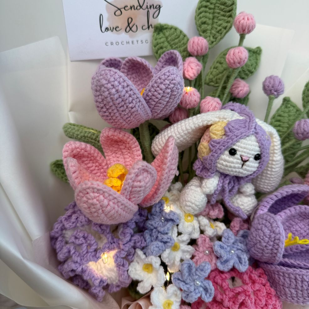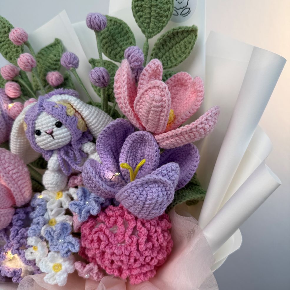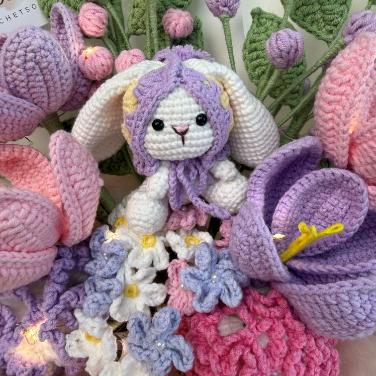 Celebrate Mum with something as gentle, warm, and everlasting as her love. Garden Hops is a handcrafted crochet flower bouquet featuring an adorable amigurumi bunny nestled among soft pastel blooms — a sweet symbol of comfort, care, and new beginnings.
