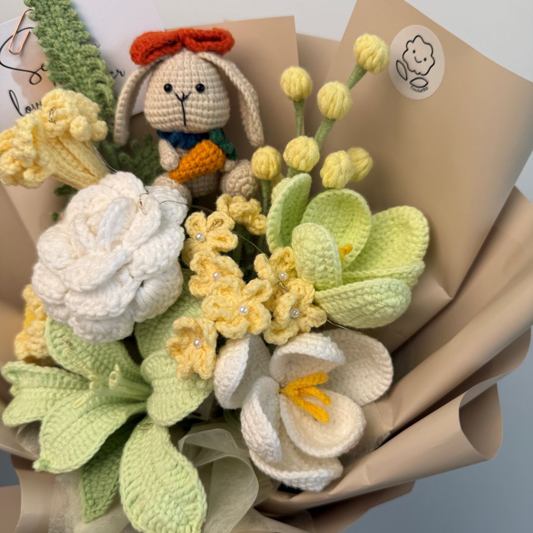 Delicate, cheerful, and heart-meltingly adorable, "Hailey" is a crochet flower bouquet designed to brighten someone’s day instantly. Featuring a charming amigurumi bunny holding a carrot, surrounded by soft pastel blooms, this bouquet captures the warmth of spring and the gentle love shared between family and friends.