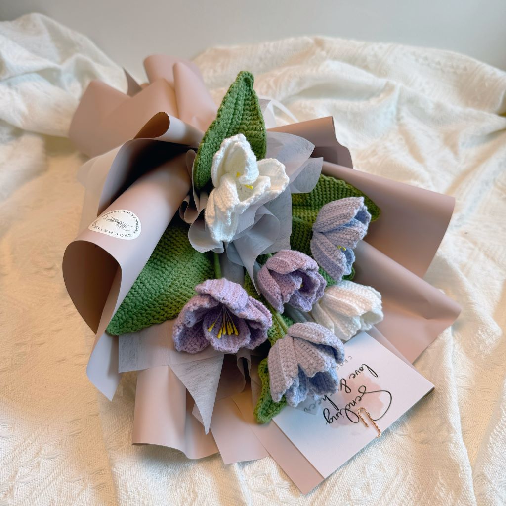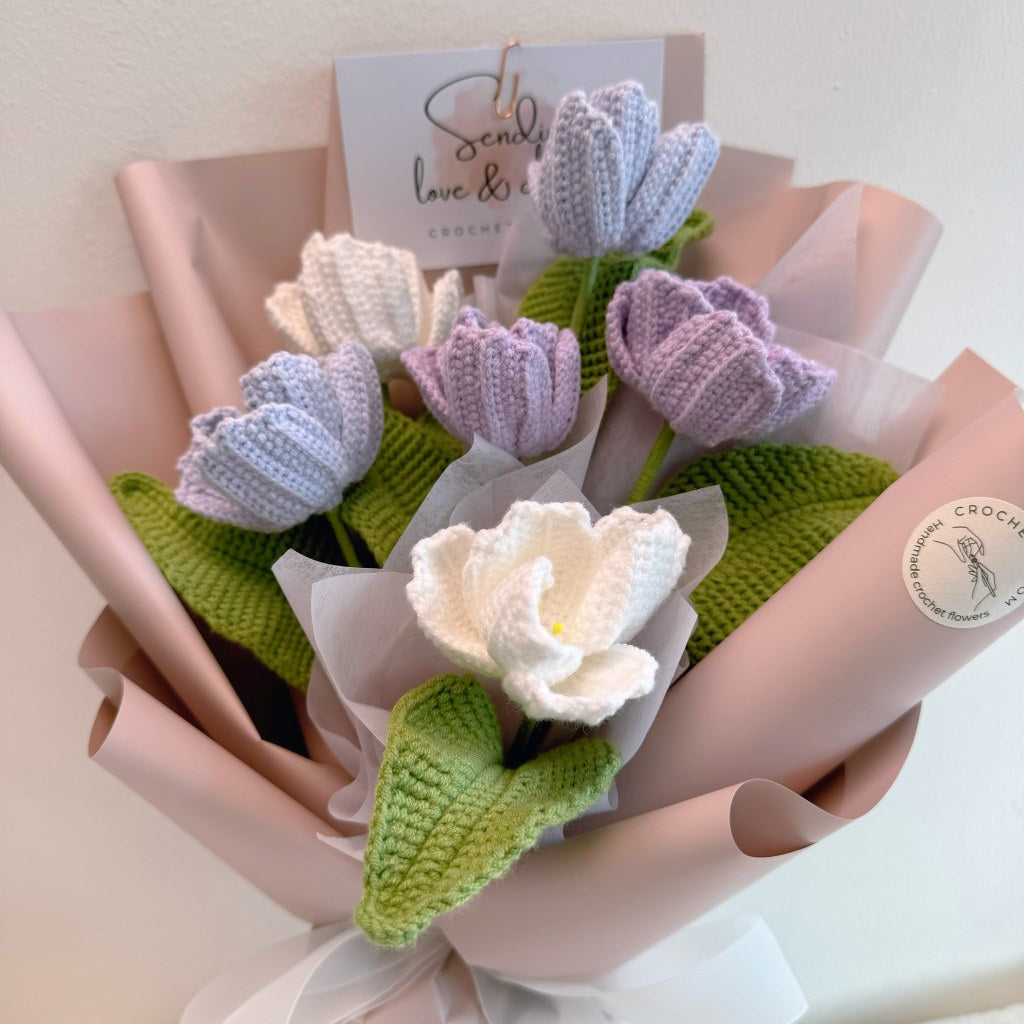 Illuminate someone’s day with the Moonlight crochet flower bouquet, a stunning blend of handcrafted Tunisian crochet tulips with big wide leaves in soft, serene shades. Perfect for any occasion, this elegant bouquet brings timeless beauty and sophistication to homes and hearts across Singapore.