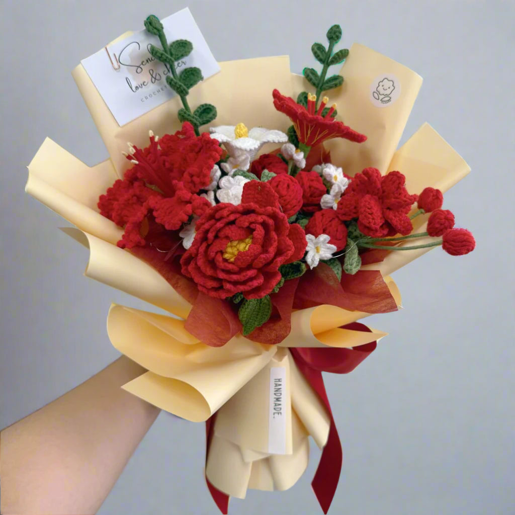 Celebrate the unwavering strength, love, and grace of mothers with Prosperity, a handcrafted crochet bouquet designed to honor and uplift. With its bold red hues symbolizing prosperity and heartfelt devotion, paired with delicate whites that represent purity and serenity, this bouquet is a meaningful keepsake for Mother’s Day and beyond.