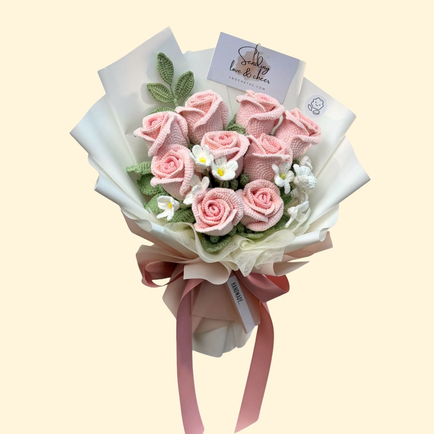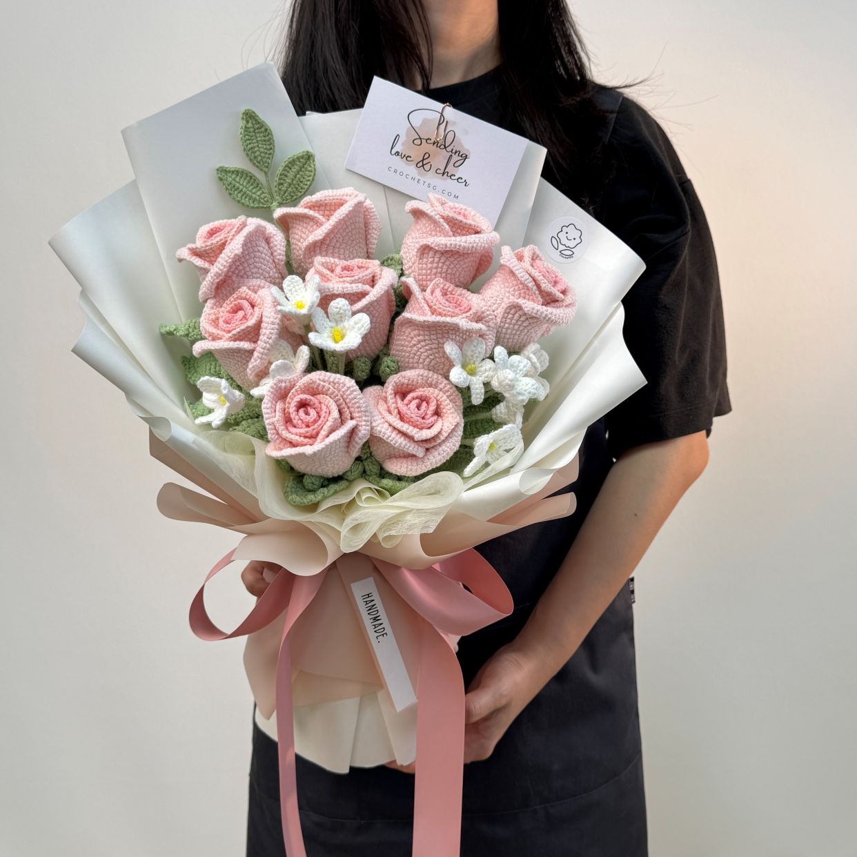Surprise your loved ones with timeless elegance and everlasting beauty with our Rosy Glow Whisper Crochet Flower Bouquet Set from CrochetSG.com! Each bouquet is meticulously handcrafted to perfection, featuring 9 or 3 delicate pink roses complemented by lush leaves and delicate baby's breath, evoking the charm of a blooming garden in the heart of France.